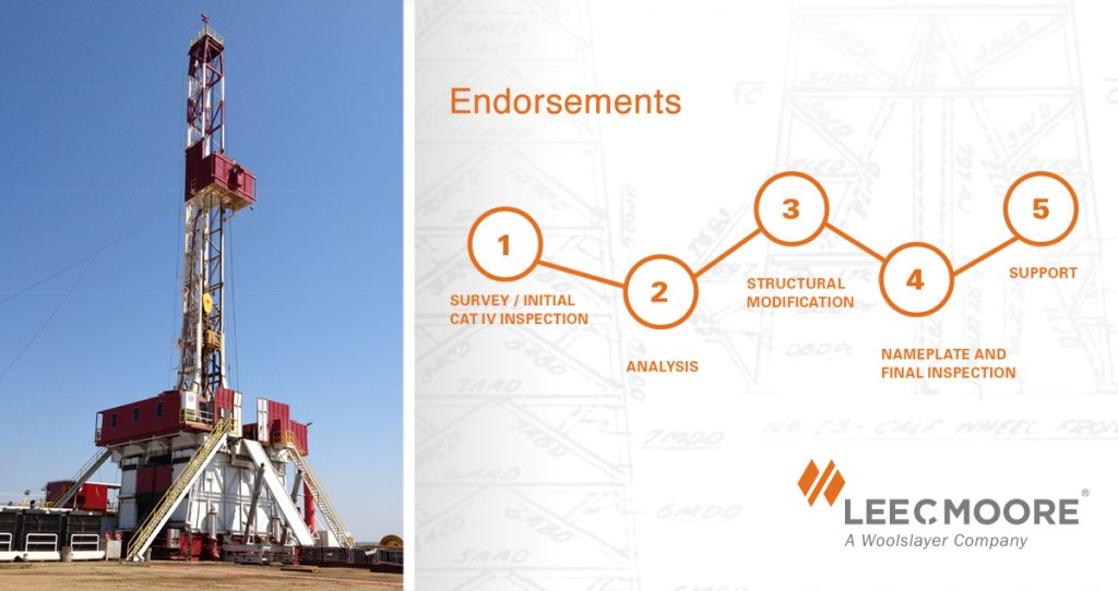 The Lee C. Moore engineering and service departments recently completed Endorsement of a North American rig for proposed upgrade in racking/setback capacity to 25,000 ft. Features and benefits of our Endorsement Program: • Mast and substructures receive a API 4F certification nameplate